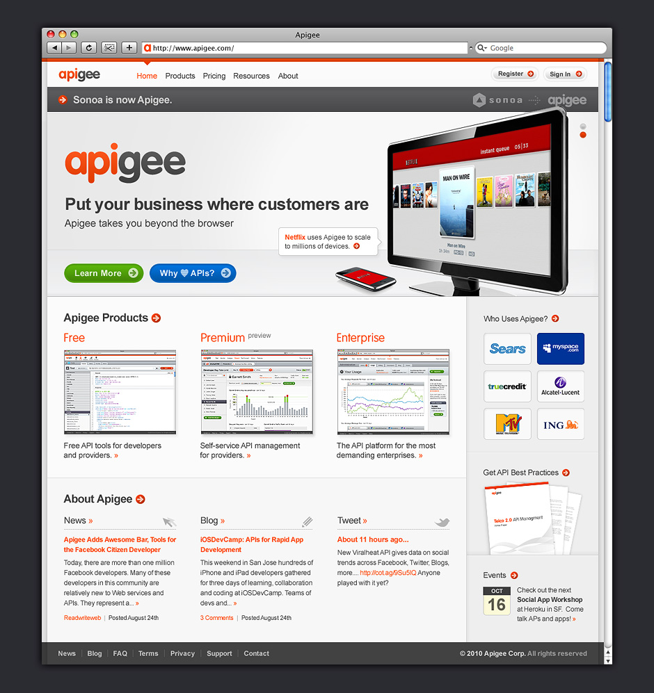 Apigee was so well-received by Sonoa's customers and investors, the company decided to rebrand itself. In the three years following the rebrand, Apigee has enjoyed a ten-fold increase in visitors and revenue, and has become a recognized leader in the API management space.