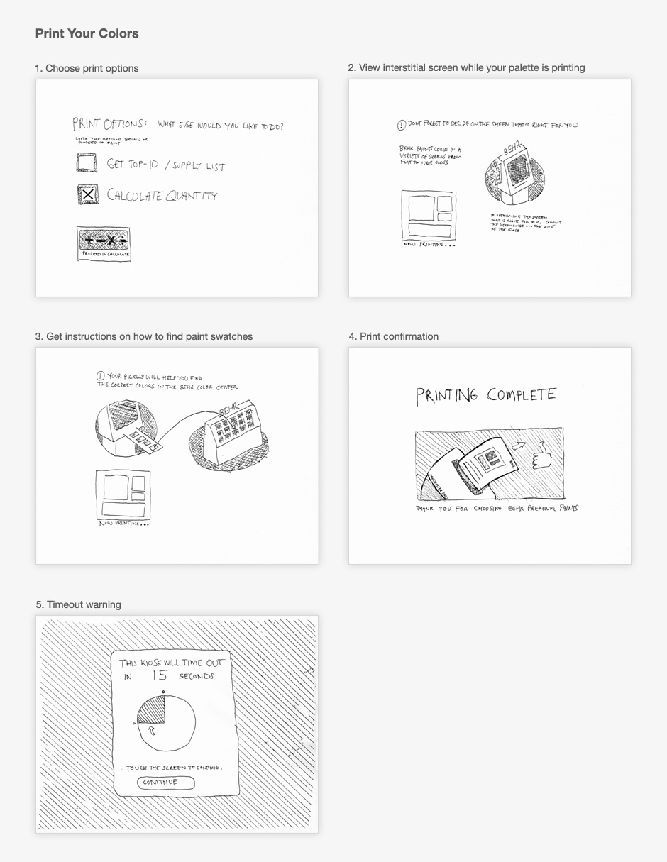 The timeline was aggressive so I prototyped the application with rough hand-drawn sketches. This allowed us to quickly explore ideas and gave us a sense about what it would be like to use the kiosk.
