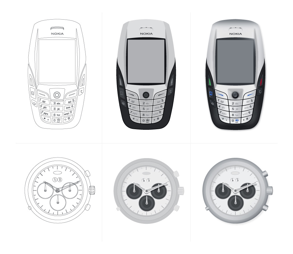 - Start with simple vector shapes. Greyscale fills are applied. Gradients, shadows, and color round things out.