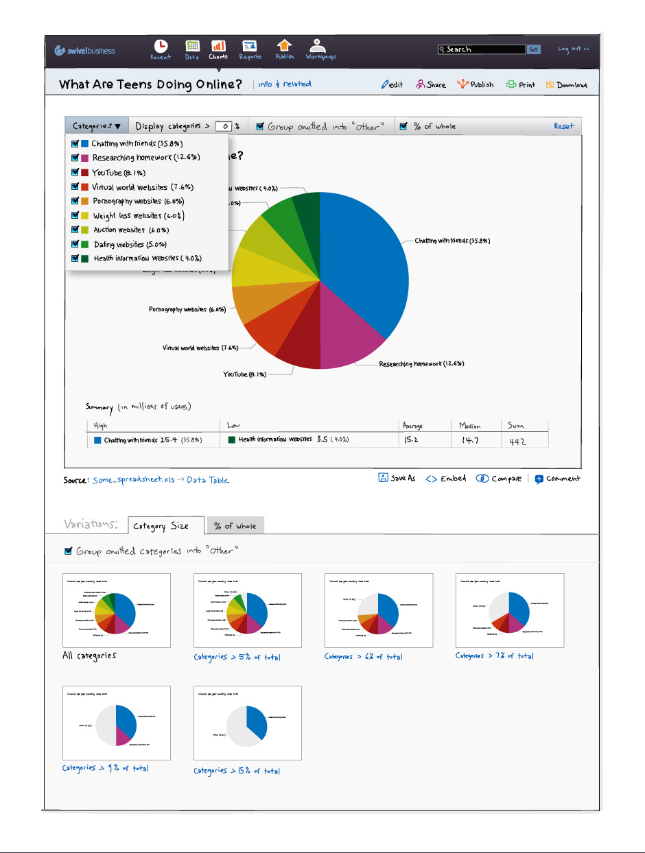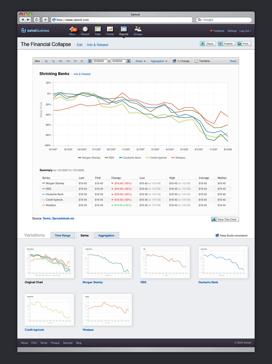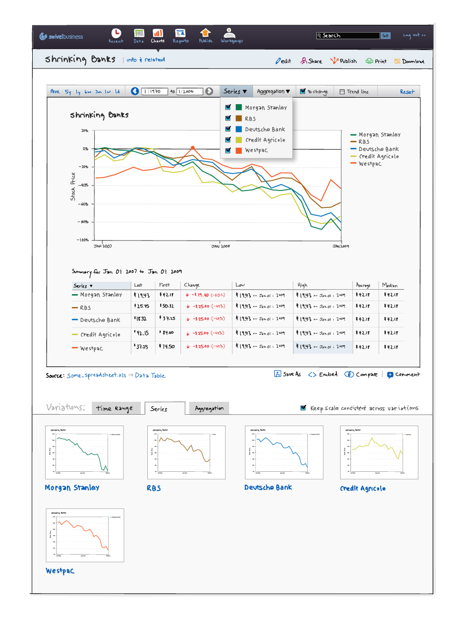 - Each chart developed in Swivel could be explored. Chart variations were generated based on the data.