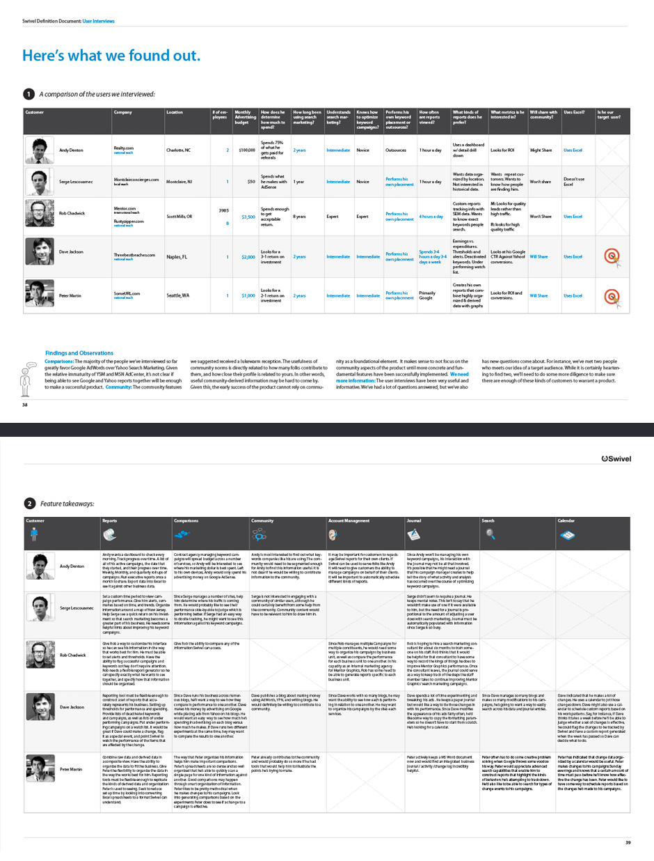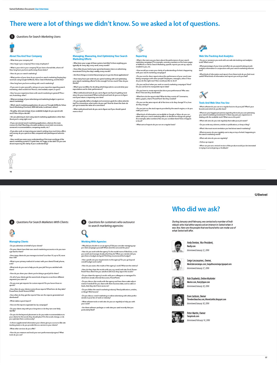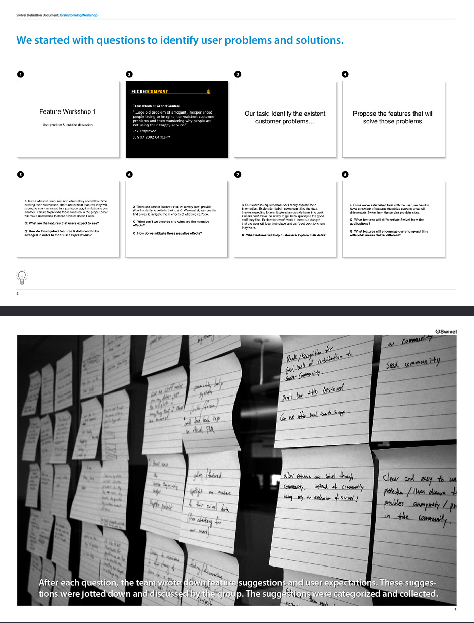 - Swivel began with a team brainstorming session. I assembled questions and organized the results.